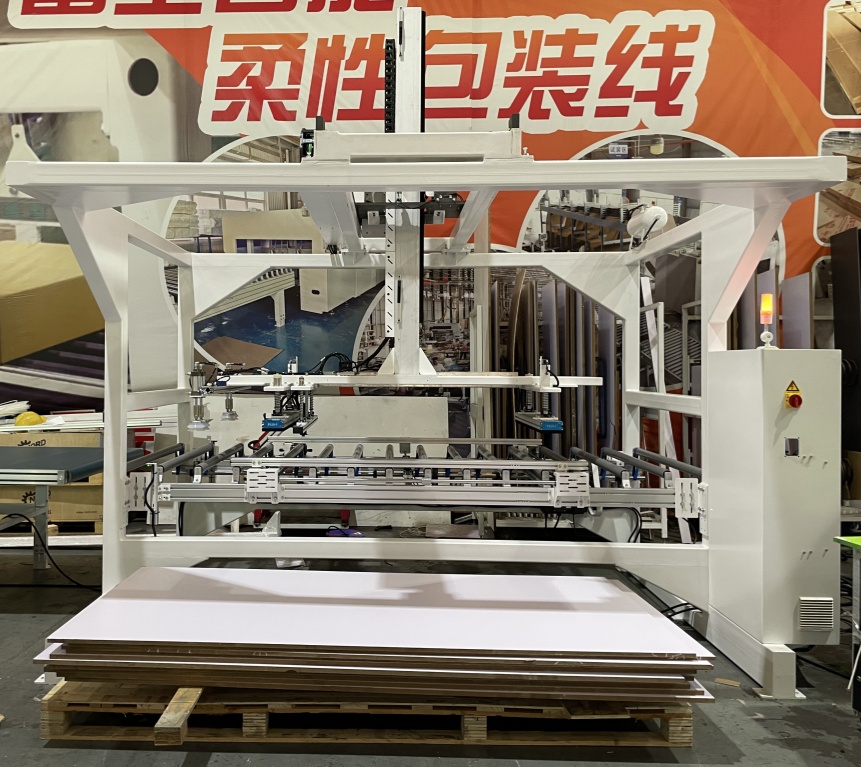 1. लोडिंग तैयारी: श्रमिक उपकरण के फीडिंग रैक पर-प्रोसेस्ड लकड़ी-आधारित पैनलों के पूरे पैलेट्स रखते हैं। रैक का लिफ्टिंग प्लेटफ़ॉर्म स्वचालित रूप से प्रारंभिक हड़पने वाली ऊंचाई पर समायोजित हो जाता है।